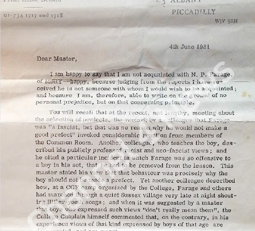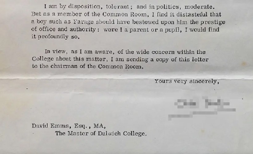 A letter from the Master of Dulwich College about N Farage whilst he was a pupil.